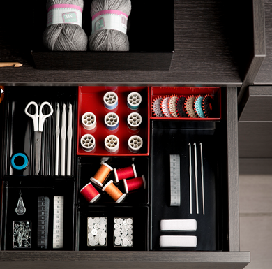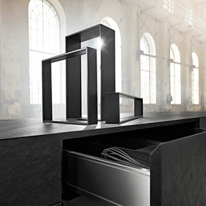 De bestekbakken in het zwart zijn er in 4 verschillende uitvoeringen. De Cuisio van kunststof gecombineerd met zwart aluminium, de Gitta kunststof bestekbakken voor Legrabox, de stalen lade-indelingen van AMBIA-LINE in de kleur Carbonzwart en de houtdecor indeling van Orgalux.