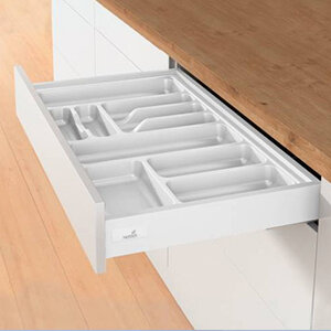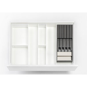 De bestekbakken in het wit zijn er in 3 verschillende uitvoeringen. De plastic bestekbakken, de Cuisio van kunststof gecombineerd met wit aluminium en de stalen lade-indelingen van AMBIA-LINE in de kleur zijdewit.