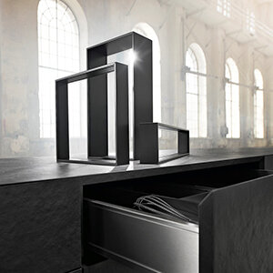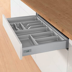 De bestekbakken in het grijs zijn er in 3 verschillende uitvoeringen. De plastic bestekbakken, de Cuisio van kunststof gecombineerd met grijs aluminium en de stalen lade-indelingen van AMBIA-LINE in de kleur Oriongrijs.