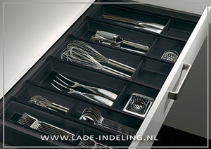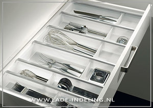 Met de bijbehorende sluitstrippen past deze stevige kunststof lade-indeling in lades van standaard keukenkasten van 30 cm tot 120 cm. Voor afwijkende breedtematen is het mogelijk een eindstuk op een schaal te plaatsen. Bij brede lades kun je twee elementen gebruiken en in het midden een extra vak creëren voor bij het grotere werkbestek. Om het werkbestek niet door de lade te laten glijden is het handig een antislipmat onder de bestekbak te leggen.