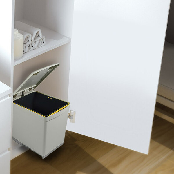 De afvalemmer wordt handmatig uit de kast getrokken, de deksel opent dan automatisch.