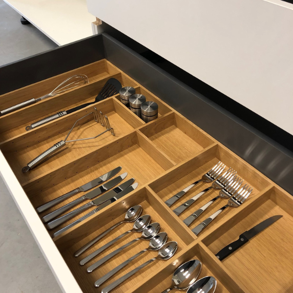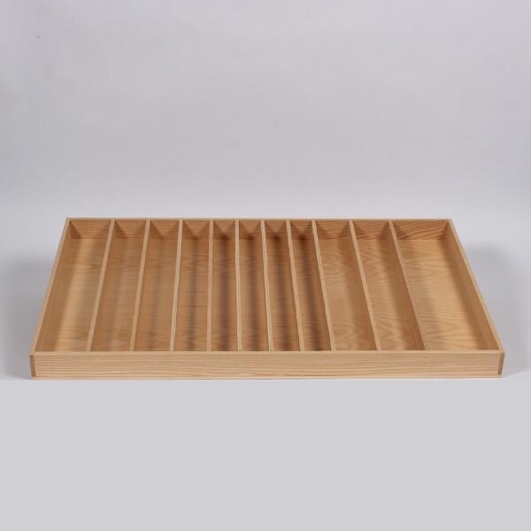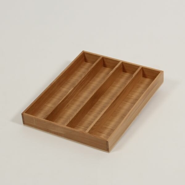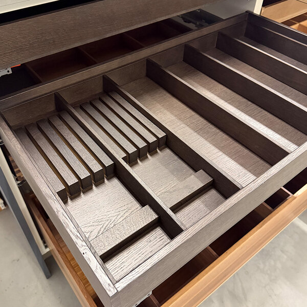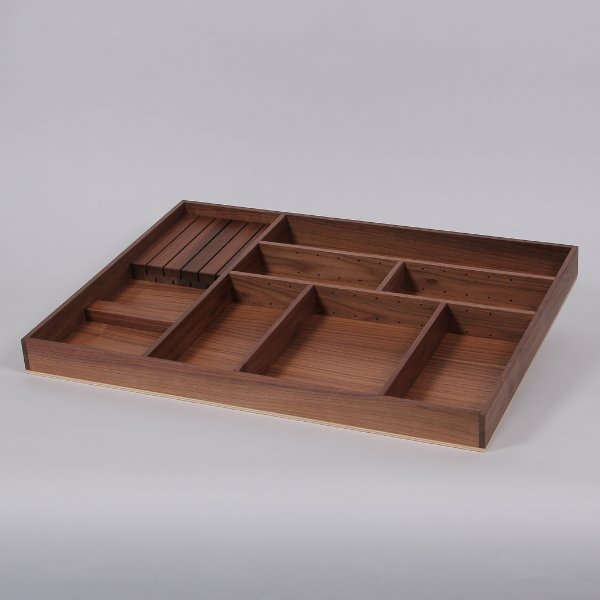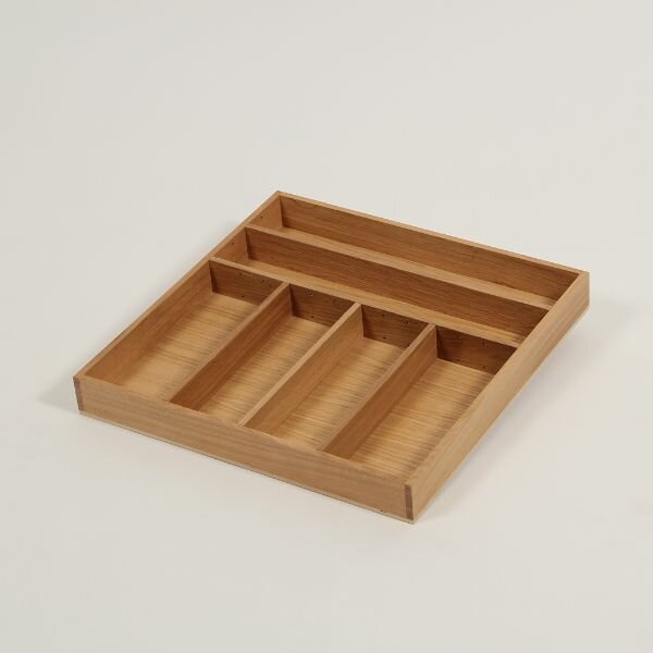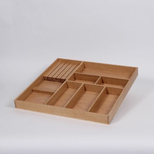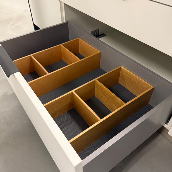 Voordat de lade-indeling geproduceerd wordt, ontvangt u van ons een tekening met de afmetingen van de lade-indeling. De prijs is afhankelijk van het houtsoort en de vakverdeling. De wanden van de bestekbak zijn recht.