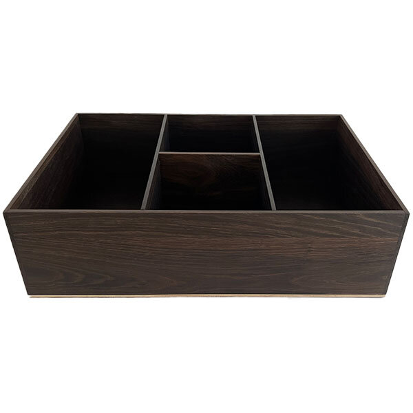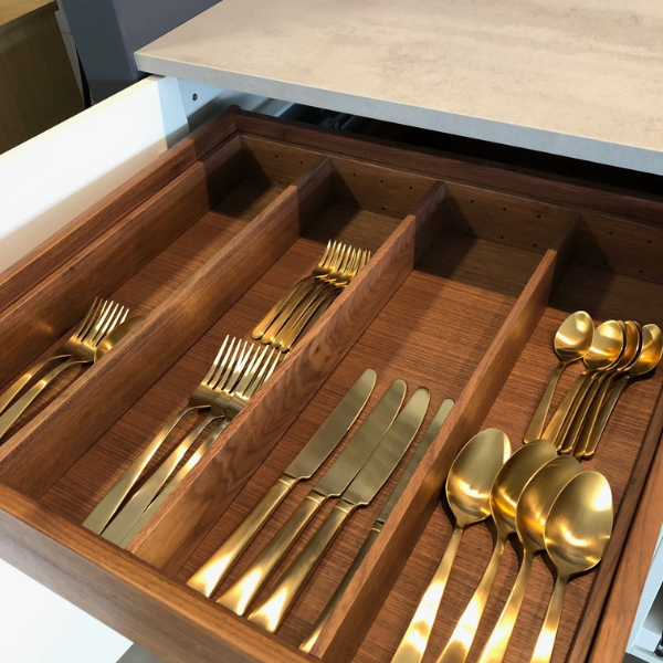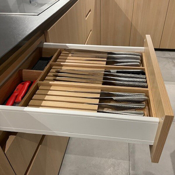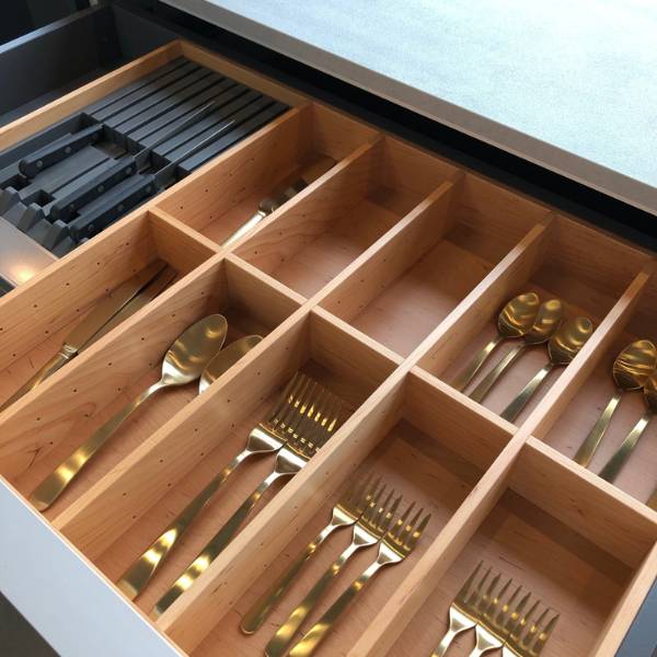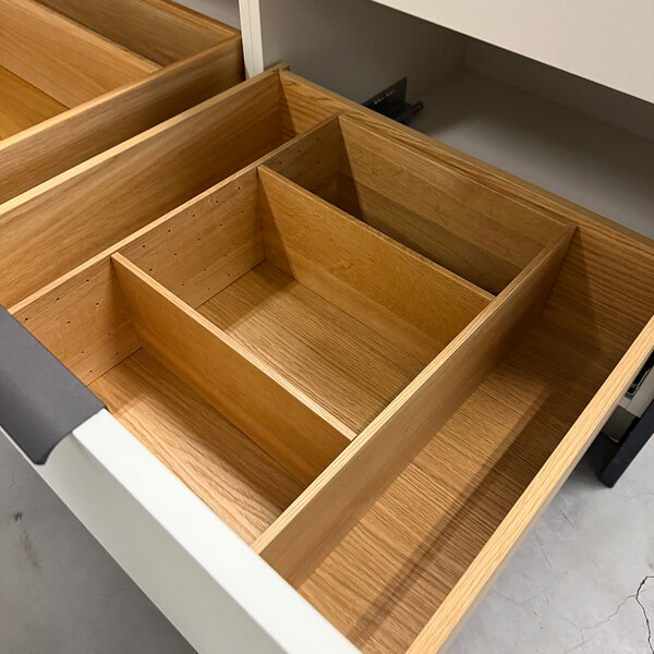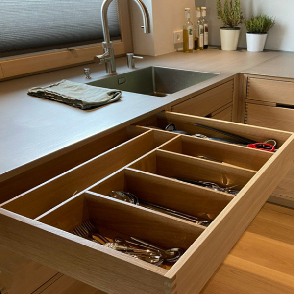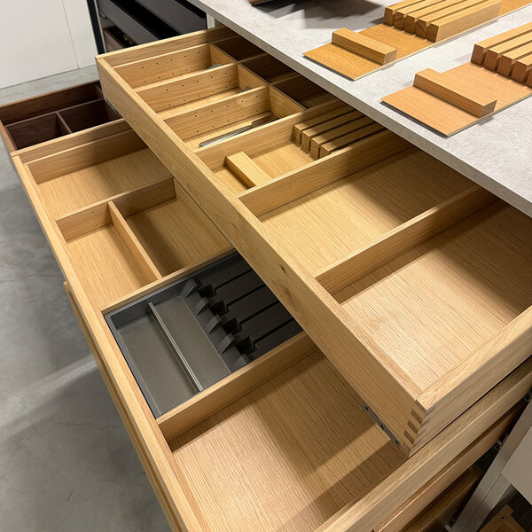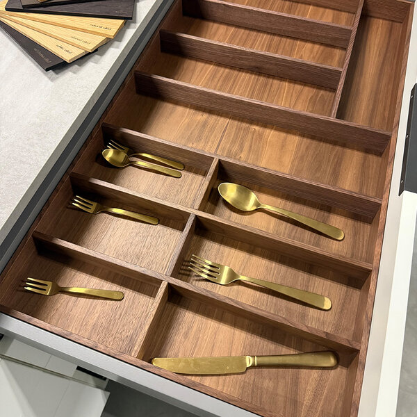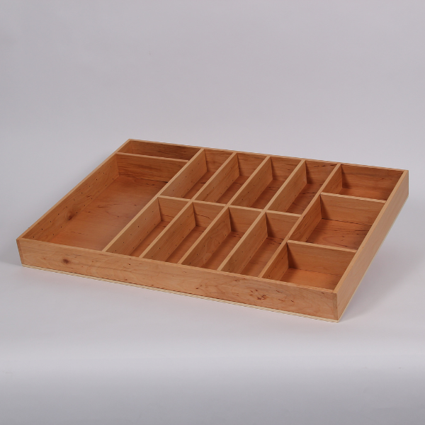 Voordat de lade-indeling geproduceerd wordt, ontvangt u van ons een tekening met de afmetingen van de lade-indeling. De prijs is afhankelijk van het houtsoort en de vakverdeling. De wanden van de bestekbak zijn recht.