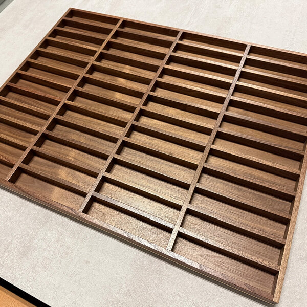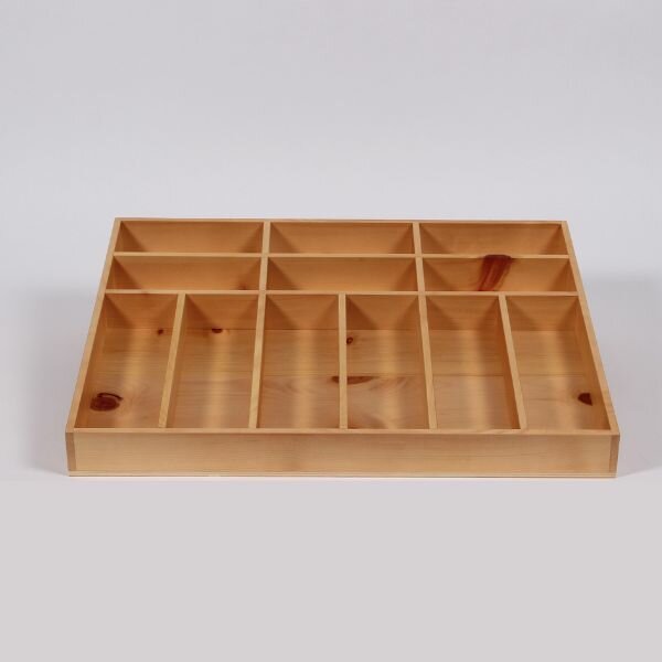 Het is mogelijk om uw houten lade-indeling geheel naar eigen wens te bestellen met een maximale maat van 1200 x 1200 mm (bxd) en een maximale hoogte maat van 255 mm.
